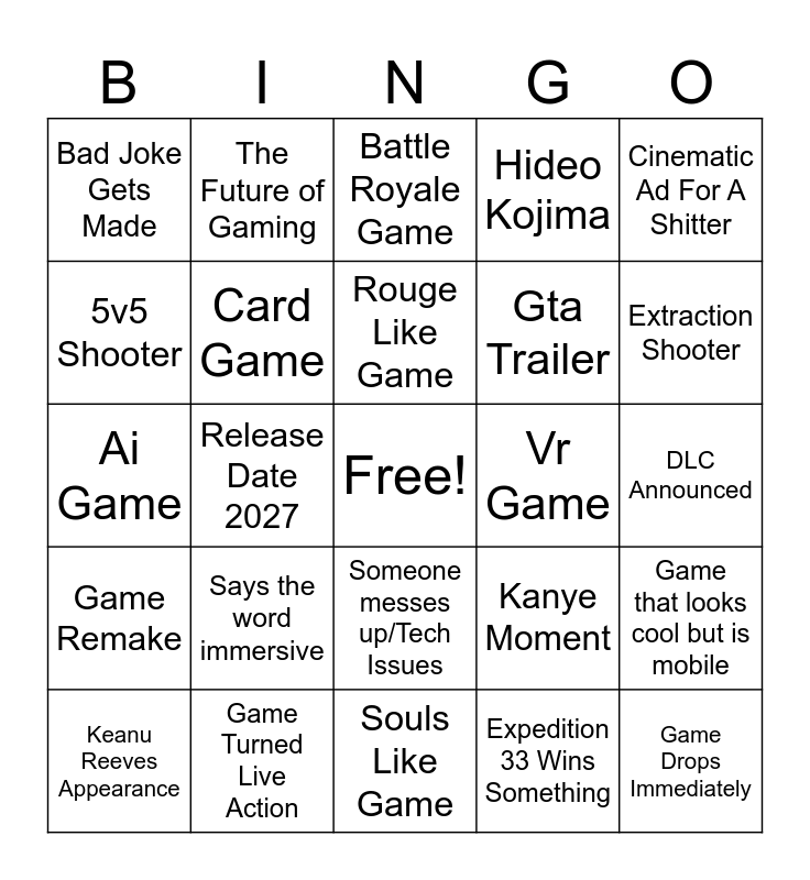 This bingo card has a free space and 28 words: Game that looks cool but is mobile, Kai Game, Gta Trailer, Expedition 33 Wins Something, 5v5 Shooter, Battle Royale Game, The Future of Gaming, Game Remake, Vr Game, Keanu Reeves Appearance, Ai Game, Hideo Kojima, Game Turned Live Action, Souls Like Game, Extraction Shooter, Friendslop, Says the word immersive, Card Game, Rouge Like Game, Someone messes up/Tech Issues, Bad Joke Gets Made, But wait theres one last thing, Game Drops Immediately, Release Date 2027, DLC Announced, Kanye Moment, Cinematic Ad For A Shitter and Steam Box.