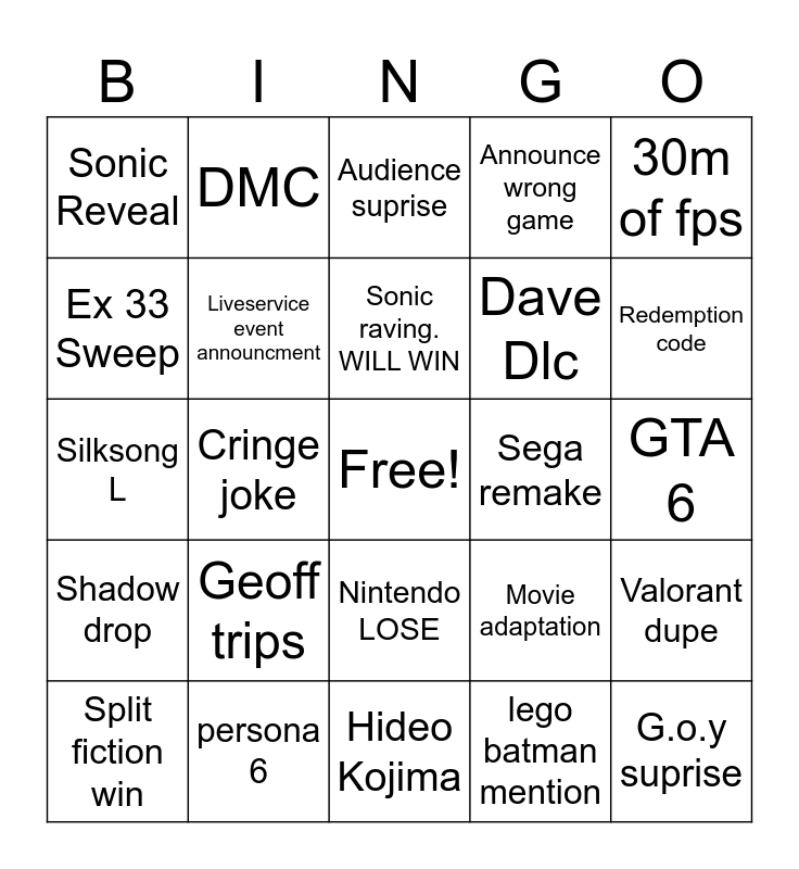 This bingo card has a free space and 24 words: Geoff trips, persona 6, Sonic raving. WILL WIN, Split fiction win, 30m of fps, Sonic Reveal, Ex 33 Sweep, DMC, Sega remake, Nintendo LOSE, Dave Dlc, Silksong L, Movie adaptation, Valorant dupe, Liveservice event announcment, lego batman mention, GTA 6, Audience suprise, Redemption code, Cringe joke, G.o.y suprise, Shadow drop, Announce wrong game and Hideo Kojima.