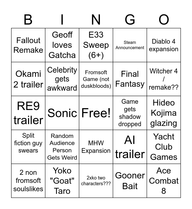 This bingo card has a free space and 24 words: Random Audience Person Gets Weird, Yoko "Goat" Taro, Fromsoft Game (not duskbloods), 2 non fromsoft soulslikes, Diablo 4 expansion, Fallout Remake, Okami 2 trailer, Geoff loves Gatcha, Game gets shadow dropped, MHW Expansion, Final Fantasy, RE9 trailer, AI trailer, Yacht Club Games, Celebrity gets awkward, Gooner Bait, Hideo Kojima glazing, E33 Sweep (6+), Witcher 4 / remake??, Sonic, Ace Combat 8, Split fiction guy swears, Steam Announcement and 2xko two characters???.