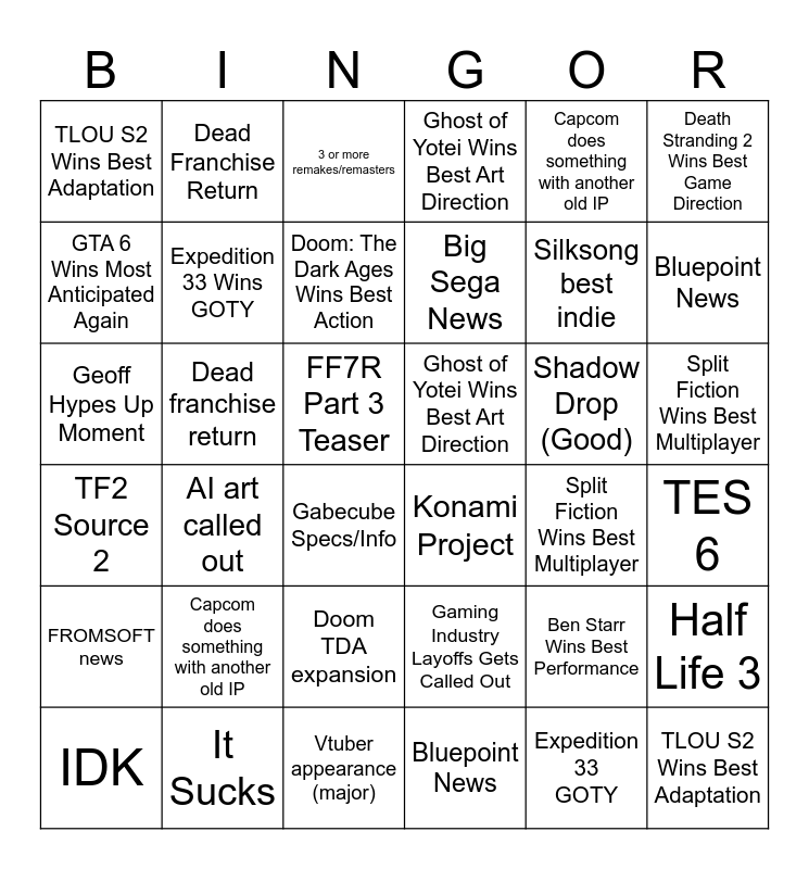 This bingo card has 71 words: The Hundred Line Wins Best Narrative, Dead Franchise Return, Death Stranding 2 Wins Best Game Direction, Expedition 33 GOTY, Split Fiction Wins Best Multiplayer, Vtuber appearance (major), Ghost of Yotei Wins Best Art Direction, Nintendo Wins Best Family Game, Doom: The Dark Ages Wins Best Action, Ben Starr Wins Best Performance, Gabecube Specs/Info, GTA 6 Wins Most Anticipated Again, Big Sega News, TLOU S2 Wins Best Adaptation, GTA 6 Trailer, Silksong best indie, TF2 Source 2, Capcom does something with another old IP, Free (Geoff), FF7R Part 3 Teaser, Shadow Drop (Good), Geoff Hypes Up Moment, AI art called out, Gaming Industry Layoffs Gets Called Out, IDK, Doom TDA Expansion, Stardew-like, KCD2 GOTY, It Sucks, Awkward or confused guest, Konami Project, 3 or more remakes/remasters, Helldivers news, Half Life 3, TES 6, Bluepoint News, The Hundred Line Wins Best Narrative, Stardew-like, Death Stranding 2 Wins Best Game Direction, Half Life 3, Split Fiction Wins Best Multiplayer, FROMSOFT news, Ghost of Yotei Wins Best Art Direction, Nintendo Wins Best Family Game, Doom: The Dark Ages Wins Best Action, Ben Starr Wins Best Performance, TF2 Source 2, GTA 6 Wins Most Anticipated Again, KCD2 GOTY, TLOU S2 Wins Best Adaptation, GTA 6 Trailer, Free (Geoff), Dead franchise return, Capcom does something with another old IP, Helldivers news, FF7R Part 3 Teaser, Expedition 33 Wins GOTY, Geoff Hypes Up Moment, Big Sega News, Gaming Industry Layoffs Gets Called Out, Gabecube Specs/Info, Silksong Best Indie, Bluepoint News, Awkwards or confused guest, TES 6, Vtuber appearance (major), 3 or more remakes/remasters, It sucks, AI art called out, Shadow Drop (Good), Doom TDA expansion and Konami project?.