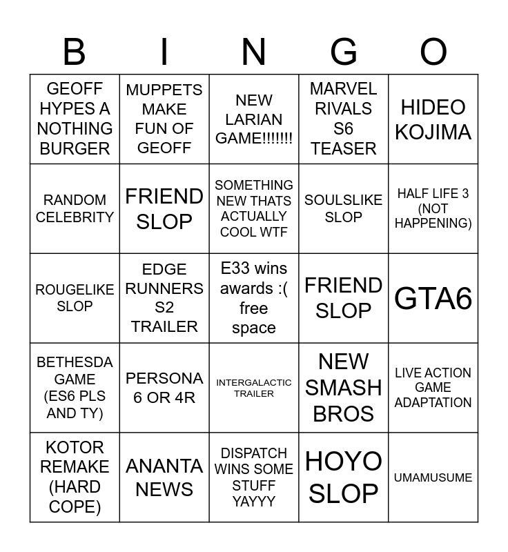 This bingo card has a free space and 24 words: PERSONA 6 OR 4R, ANANTA NEWS, SOMETHING NEW THATS ACTUALLY COOL WTF, KOTOR REMAKE (HARD COPE), HIDEO KOJIMA, GEOFF HYPES A NOTHING BURGER, RANDOM CELEBRITY, MUPPETS MAKE FUN OF GEOFF, FRIEND SLOP, INTERGALACTIC TRAILER, SOULSLIKE SLOP, ROUGELIKE SLOP, NEW SMASH BROS, LIVE ACTION GAME ADAPTATION, FRIEND SLOP, HOYO SLOP, GTA6, NEW LARIAN GAME!!!!!!!, HALF LIFE 3 (NOT HAPPENING), EDGE RUNNERS S2 TRAILER, UMAMUSUME, BETHESDA GAME (ES6 PLS AND TY), MARVEL RIVALS S6 TEASER and DISPATCH WINS SOME STUFF YAYYY.