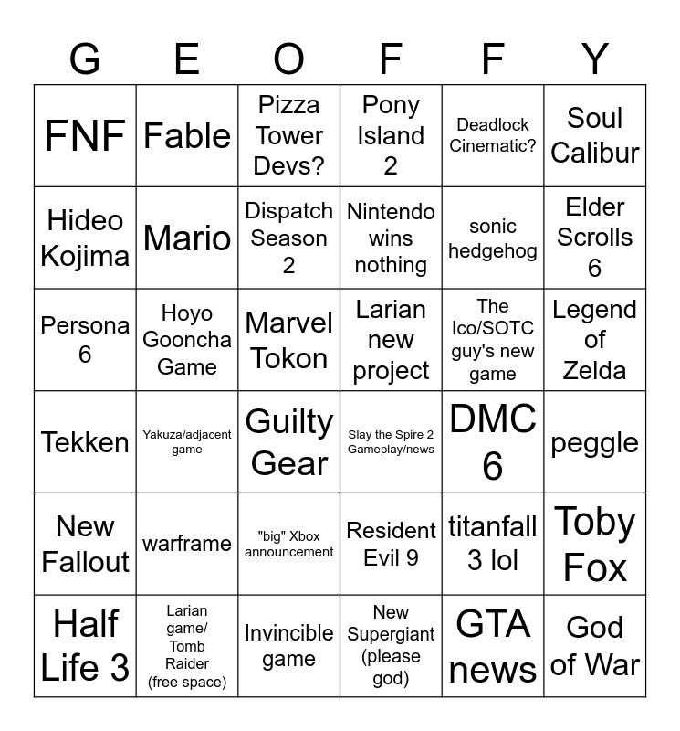 This bingo card has 39 words: Larian game/ Tomb Raider (free space), Half Life 3, Bloodborne Anything, Hideo Kojima, Guilty Gear, Legend of Zelda, Mario, God of War, Deadlock Cinematic?, Larian new project, Elder Scrolls 6, Pony Island 2, Persona 6, Marvel Tokon, Hoyo Gooncha Game, The Ico/SOTC guy's new game, titanfall 3 lol, FNF, Invincible game, Tekken, Soul Calibur, DMC 6, Dispatch Season 2, Nintendo wins nothing, New Supergiant (please god), "big" Xbox announcement, New Fallout, GTA news, warframe, Fable, New Bigmode Game (dunkey), Toby Fox, Pizza Tower Devs?, Slay the Spire 2 Gameplay/news, peggle, Resident Evil 9, Yakuza/adjacent game, sonic hedgehog and Non-Mario/Zelda Nintendo.