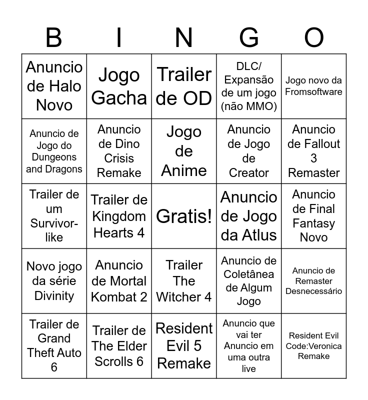 This bingo card has a free space and 33 words: Half-Life 3 Comfirmado, Anuncio de God of War Novo, Trailer de Kingdom Hearts 4, Trailer de Final Fantasy VII - Part 3, Novo jogo da série Divinity, Anuncio de Dino Crisis Remake, Jogo novo da Fromsoftware, Trailer de Grand Theft Auto 6, Jogo Gacha, Anuncio de Assasin`s Creed Novo, Jogo de Anime, Trailer de OD, Expedition 33 Ganha GOTY, Silksong Ganha Jogo Indie, Anuncio de Jogo da Atlus, Anuncio de Fallout 3 Remaster, Trailer de The Elder Scrolls 6, Trailer de um Survivor-like, Anuncio de Mortal Kombat 2, Anuncio de Coletânea de Algum Jogo, Trailer The Witcher 4, Trailer Dragon Quest, Anuncio de Halo Novo, Anuncio de Final Fantasy Novo, Resident Evil 5 Remake, Resident Evil Code:Veronica Remake, DLC/ Expansão de um jogo (não MMO), Anuncio de Jogo de Creator, Anuncio de Jogo do Dungeons and Dragons, Anuncio de Remaster Desnecessário, Anuncio Final Fantasy IX Remake, Anuncio que vai ter Anuncio em uma outra live and Trailer de Forza Horizon 6.
