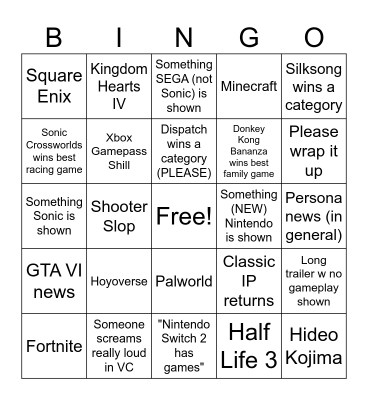 This bingo card has a free space and 24 words: Hoyoverse, Someone screams really loud in VC, Dispatch wins a category (PLEASE), Fortnite, Silksong wins a category, Square Enix, Sonic Crossworlds wins best racing game, Kingdom Hearts IV, Something (NEW) Nintendo is shown, Palworld, Donkey Kong Bananza wins best family game, Something Sonic is shown, Classic IP returns, Long trailer w no gameplay shown, Xbox Gamepass Shill, Half Life 3, Persona news (in general), Something SEGA (not Sonic) is shown, Please wrap it up, Shooter Slop, Hideo Kojima, GTA VI news, Minecraft and "Nintendo Switch 2 has games".