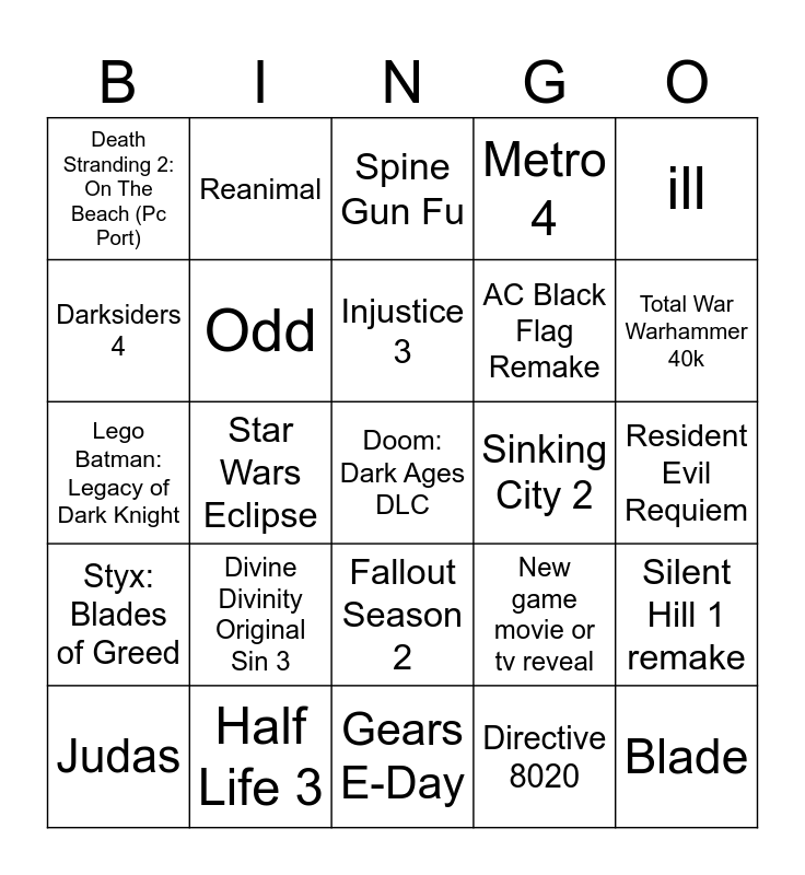 This bingo card has a free space and 24 words: Divine Divinity Original Sin 3, Half Life 3, Injustice 3, Judas, ill, Death Stranding 2: On The Beach (Pc Port), Darksiders 4, Reanimal, Sinking City 2, Fallout Season 2, AC Black Flag Remake, Lego Batman: Legacy of Dark Knight, New game movie or tv reveal, Silent Hill 1 remake, Odd, Directive 8020, Resident Evil Requiem, Spine Gun Fu, Total War Warhammer 40k, Star Wars Eclipse, Blade, Styx: Blades of Greed, Metro 4 and Gears E-Day.