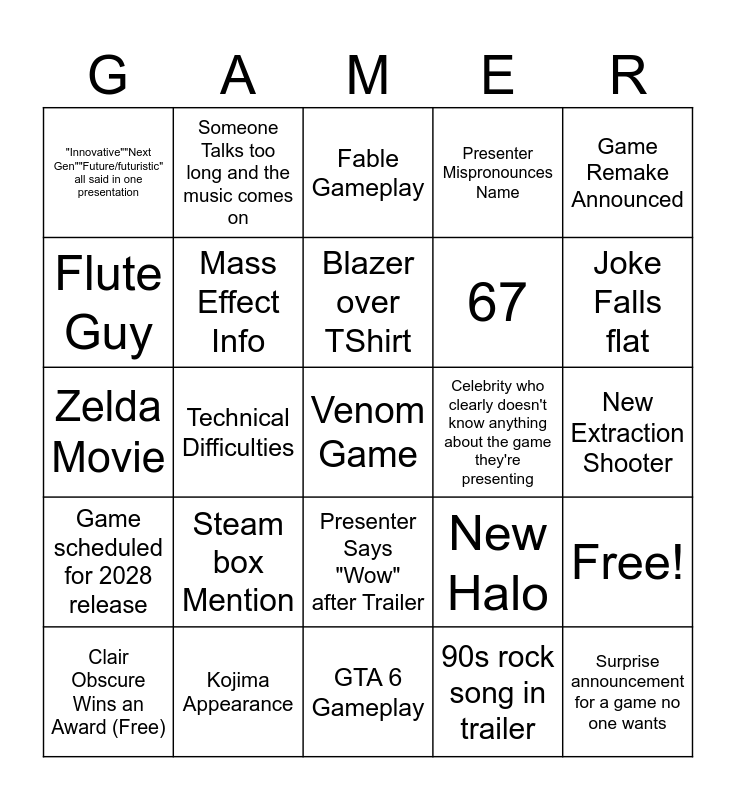 This bingo card has 26 words: Presenter Says "Wow" after Trailer, 90s rock song in trailer, Blazer over TShirt, Kojima Appearance, Game Remake Announced, "Innovative""Next Gen""Future/futuristic" all said in one presentation, Flute Guy, Someone Talks too long and the music comes on, New Extraction Shooter, New Halo, 67, Zelda Movie, Free!, Clair Obscure Wins an Award (Free), Technical Difficulties, "Releases Today", Presenter Mispronounces Name, Game scheduled for 2028 release, Fable Gameplay, Venom Game, Joke Falls flat, GTA 6 Gameplay, Celebrity who clearly doesn't know anything about the game they're presenting, Steam box Mention, Mass Effect Info and Surprise announcement for a game no one wants.
