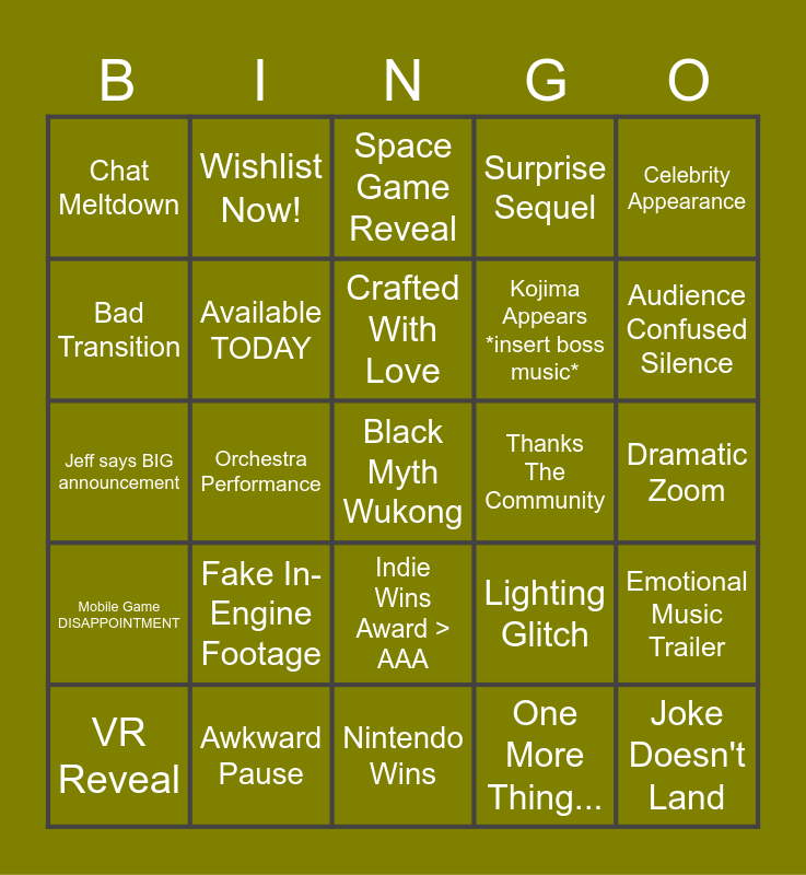 This bingo card has a free space and 41 words: World Premiere, Jeff says BIG announcement, Emotional Dev Speech, Available TODAY, Awkward Pause, Indie Wins Award > AAA, Crafted With Love, Crowd Half-Claps, Celebrity Appearance, Mobile Game DISAPPOINTMENT, Orchestra Performance, Surprise Sequel, Joke Doesn't Land, Dramatic Zoom, Thanks The Community, Fake In-Engine Footage, Presenter Stumbles/Trips, Chat Meltdown, Unexpected Crossover, Space Game Reveal, Emotional Music Trailer, 2026 Release Date, Nintendo Wins, Kojima Appears *insert boss music*, Sad Cover Song trailer, RTX Logo, One More Thing..., Fake Gameplay, Audience Confused Silence, Parkour Action Sequence, Space Exploration Game, Wishlist Now!, VR Reveal, Award Speech Cut Short, Lighting Glitch, Bad Transition, Microphone Cuts Out, E33 Wins Award, Maggie Says "IDK what this is", Fromsoft Announcement and Elder Scrolls Announcement.