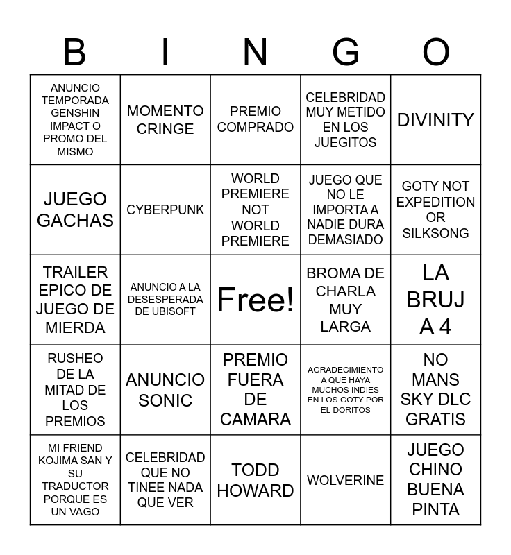 This bingo card has a free space and 24 words: ANUNCIO SONIC, CELEBRIDAD QUE NO TINEE NADA QUE VER, WORLD PREMIERE NOT WORLD PREMIERE, MI FRIEND KOJIMA SAN Y SU TRADUCTOR PORQUE ES UN VAGO, DIVINITY, ANUNCIO TEMPORADA GENSHIN IMPACT O PROMO DEL MISMO, JUEGO GACHAS, MOMENTO CRINGE, BROMA DE CHARLA MUY LARGA, PREMIO FUERA DE CAMARA, JUEGO QUE NO LE IMPORTA A NADIE DURA DEMASIADO, TRAILER EPICO DE JUEGO DE MIERDA, AGRADECIMIENTO A QUE HAYA MUCHOS INDIES EN LOS GOTY POR EL DORITOS, NO MANS SKY DLC GRATIS, CYBERPUNK, WOLVERINE, LA BRUJ A 4, PREMIO COMPRADO, GOTY NOT EXPEDITION OR SILKSONG, ANUNCIO A LA DESESPERADA DE UBISOFT, JUEGO CHINO BUENA PINTA, RUSHEO DE LA MITAD DE LOS PREMIOS, CELEBRIDAD MUY METIDO EN LOS JUEGITOS and TODD HOWARD.