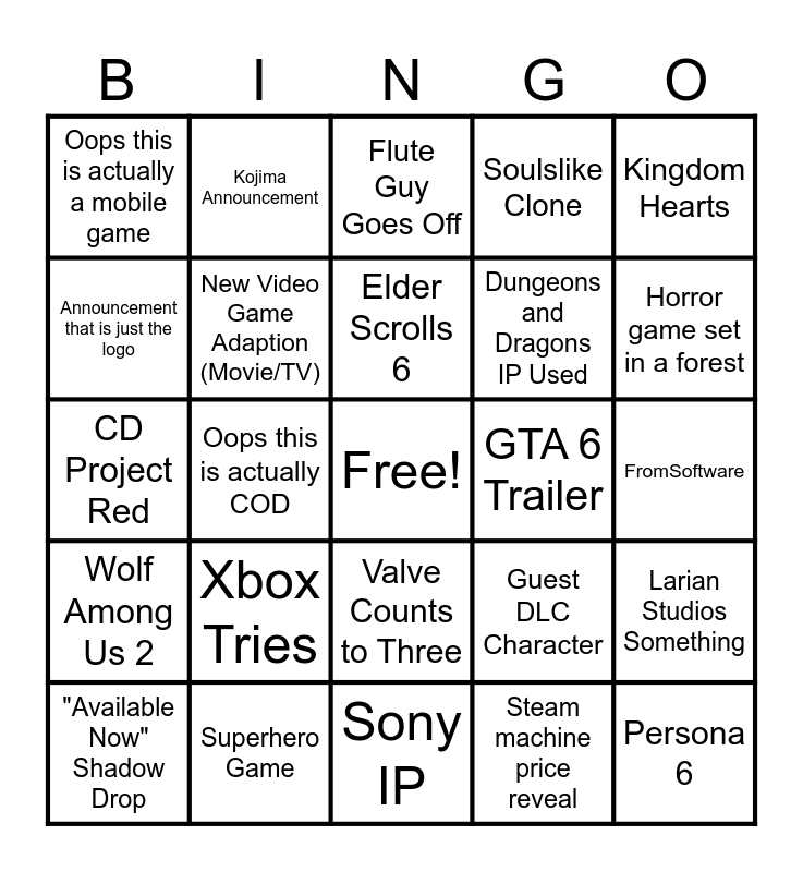 This bingo card has a free space and 29 words: "Available Now" Shadow Drop, Unexpected IP Revival, Oops this is actually COD, Oops this is actually a gacha game, Oops this is actually a mobile game, Flute Guy Goes Off, New Video Game Adaption (Movie/TV), Xbox Tries, GTA 6 Trailer, Superhero Game, FromSoftware, Persona 6, Sony IP, Steam machine price reveal, Horror game set in a forest, Stranger than Heaven, Valve Counts to Three, Wolf Among Us 2, Kingdom Hearts, CD Project Red, Guest DLC Character, Fable Update, Dungeons and Dragons IP Used, Announcement that is just the logo, Soulslike Clone, Kojima Announcement, Larian Studios Something, Elder Scrolls 6 and Okami Gameplay.