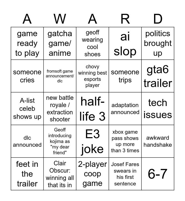 This bingo card has a free space and 24 words: Geoff introducing kojima as "my dear friend", Clair Obscur: winning all that its in, chovy winning best esports player, feet in the trailer, politics brought up, game ready to play, someone cries, gatcha game/ anime, adaptation announced, E3 joke, someone trips, A-list celeb shows up, xbox game pass shows up more than 3 times, awkward handshake, fromsoft game announcement/ dlc, Josef Fares swears in his first sentence, tech issues, geoff wearing cool shoes, gta6 trailer, new battle royale / extraction shooter, 6-7, dlc announced, ai slop and 2-player coop game.