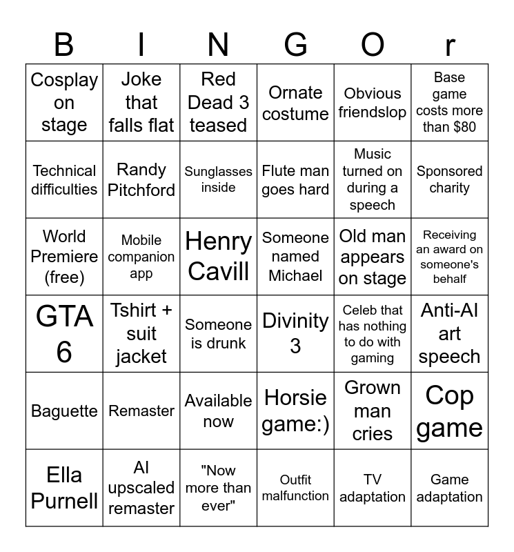 This bingo card has 50 words: Half Life mentioned, World Premiere (free), AI Game, Celeb that has nothing to do with gaming, Old man appears on stage, AI upscaled remaster, Joke that falls flat, Someone says 67, Base game costs more than $80, "Now more than ever", Technical difficulties, Ornate costume, Tshirt + suit jacket, GTA 6, Exp. 33 wins at least 3 awards, Horsie game:), Randy Pitchford, Mobile companion app, "the future of gaming", Obvious friendslop, Sponsored charity, Anti-AI art speech, Cosplay on stage, Sunglasses inside, One guy gets hype in the audience, Baguette, Flute man goes hard, Valve hardware showcase, Red Dead 3 teased, Receiving an award on someone's behalf, Really sad story, Grown man cries, Woman can't walk in her heels, Gaymers targeted, Divinity 3, Available now, Outfit malfunction, TV adaptation, Game adaptation, Henry Cavill, Ella Purnell, Kpop Demon Hunters, Cop game, Real gameplay trailer, Someone is drunk, Music turned on during a speech, Remaster, New Sonic, Someone named Michael and Someone is sick.