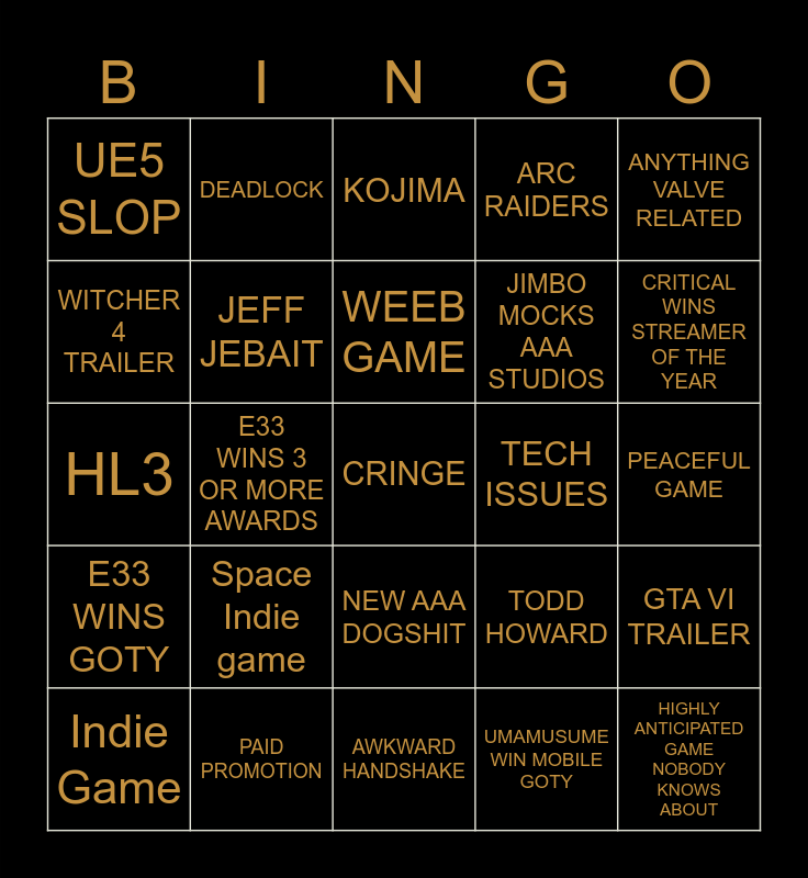 This bingo card has a free space and 24 words: Indie Game, Space Indie game, WEEB GAME, UMAMUSUME WIN MOBILE GOTY, ANYTHING VALVE RELATED, UE5 SLOP, DEADLOCK, KOJIMA, TECH ISSUES, PEACEFUL GAME, HL3, JEFF JEBAIT, TODD HOWARD, GTA VI TRAILER, WITCHER 4 TRAILER, PAID PROMOTION, AWKWARD HANDSHAKE, ARC RAIDERS, CRITICAL WINS STREAMER OF THE YEAR, E33 WINS GOTY, E33 WINS 3 OR MORE AWARDS, NEW AAA DOGSHIT, JIMBO MOCKS AAA STUDIOS and HIGHLY ANTICIPATED GAME NOBODY KNOWS ABOUT.