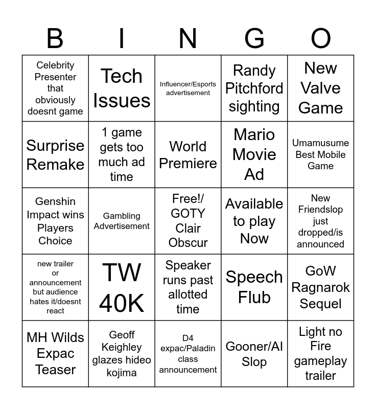 This bingo card has a free space and 24 words: TW 40K, Geoff Keighley glazes hideo kojima, World Premiere, MH Wilds Expac Teaser, New Valve Game, Celebrity Presenter that obviously doesnt game, Surprise Remake, Tech Issues, Available to play Now, Speaker runs past allotted time, Mario Movie Ad, Genshin Impact wins Players Choice, Speech Flub, GoW Ragnarok Sequel, 1 game gets too much ad time, Gooner/AI Slop, New Friendslop just dropped/is announced, Influencer/Esports advertisement, Umamusume Best Mobile Game, Gambling Advertisement, Light no Fire gameplay trailer, new trailer or announcement but audience hates it/doesnt react, Randy Pitchford sighting and D4 expac/Paladin class announcement.
