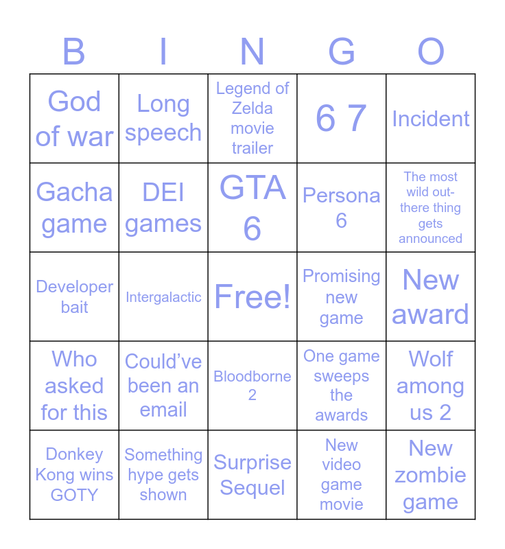This bingo card has a free space and 24 words: Could’ve been an email, Something hype gets shown, GTA 6, Donkey Kong wins GOTY, Incident, God of war, Gacha game, Long speech, Promising new game, Bloodborne 2, Persona 6, Developer bait, One game sweeps the awards, Wolf among us 2, DEI games, New video game movie, New award, Legend of Zelda movie trailer, The most wild out-there thing gets announced, Intergalactic, New zombie game, Who asked for this, 6 7 and Surprise Sequel.