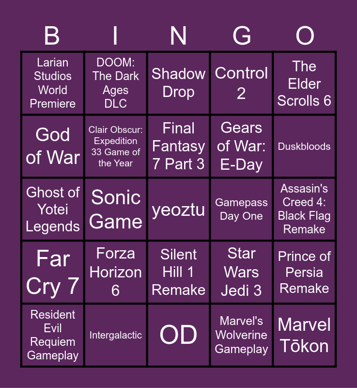 This bingo card has a free space and 24 words: Forza Horizon 6, Intergalactic, Final Fantasy 7 Part 3, Resident Evil Requiem Gameplay, The Elder Scrolls 6, Larian Studios World Premiere, God of War, DOOM: The Dark Ages DLC, Gamepass Day One, Silent Hill 1 Remake, Gears of War: E-Day, Ghost of Yotei Legends, Star Wars Jedi 3, Prince of Persia Remake, Clair Obscur: Expedition 33 Game of the Year, Marvel's Wolverine Gameplay, Assasin's Creed 4: Black Flag Remake, Shadow Drop, Duskbloods, Sonic Game, Marvel Tōkon, Far Cry 7, Control 2 and OD.