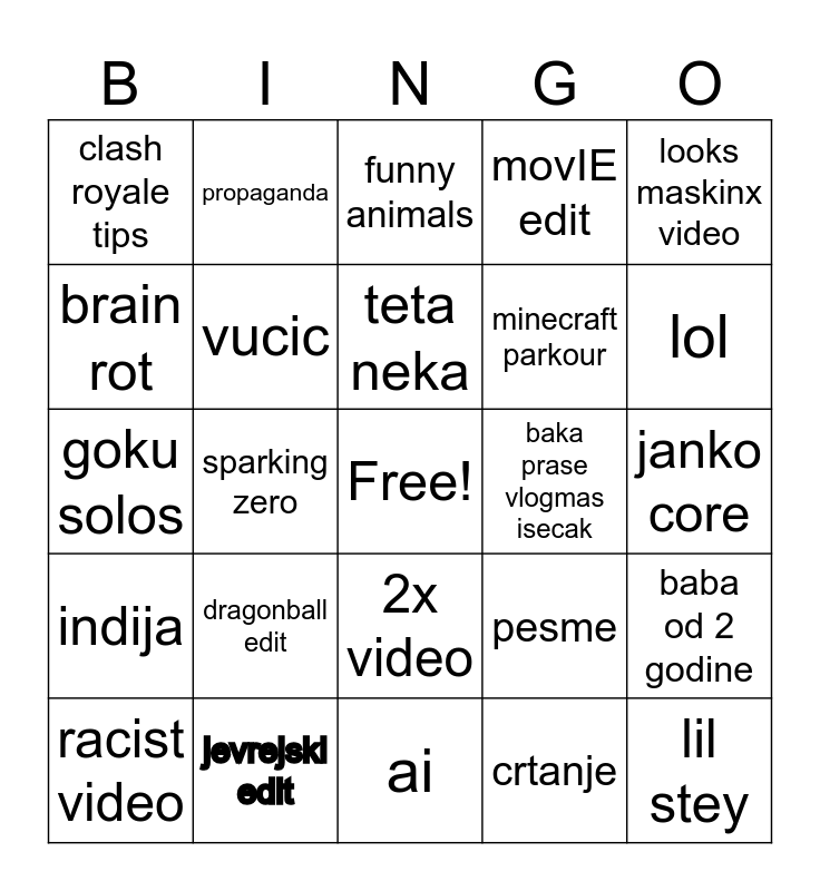 This bingo card has a free space and 24 words: dragonball edit, jevrejski edit, teta neka, racist video, looks maskinx video, clash royale tips, brain rot, propaganda, baka prase vlogmas isecak, 2x video, minecraft parkour, goku solos, pesme, baba od 2 godine, vucic, crtanje, janko core, funny animals, lol, sparking zero, lil stey, indija, movIE edit and ai.