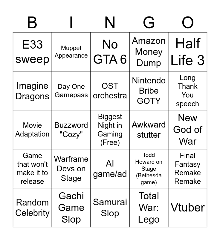 This bingo card has a free space and 25 words: Warframe Devs on Stage, Samurai Slop, OST orchestra, Random Celebrity, Half Life 3, E33 sweep, Imagine Dragons, Muppet Appearance, Awkward stutter, AI game/ad, Nintendo Bribe GOTY, Movie Adaptation, Todd Howard on Stage (Bethesda game), Final Fantasy Remake Remake, Day One Gamepass, Tech Issues, New God of War, No GTA 6, Long Thank You speech, Buzzword "Cozy", Vtuber, Gachi Game Slop, Game that won't make it to release, Amazon Money Dump and Total War: Lego.