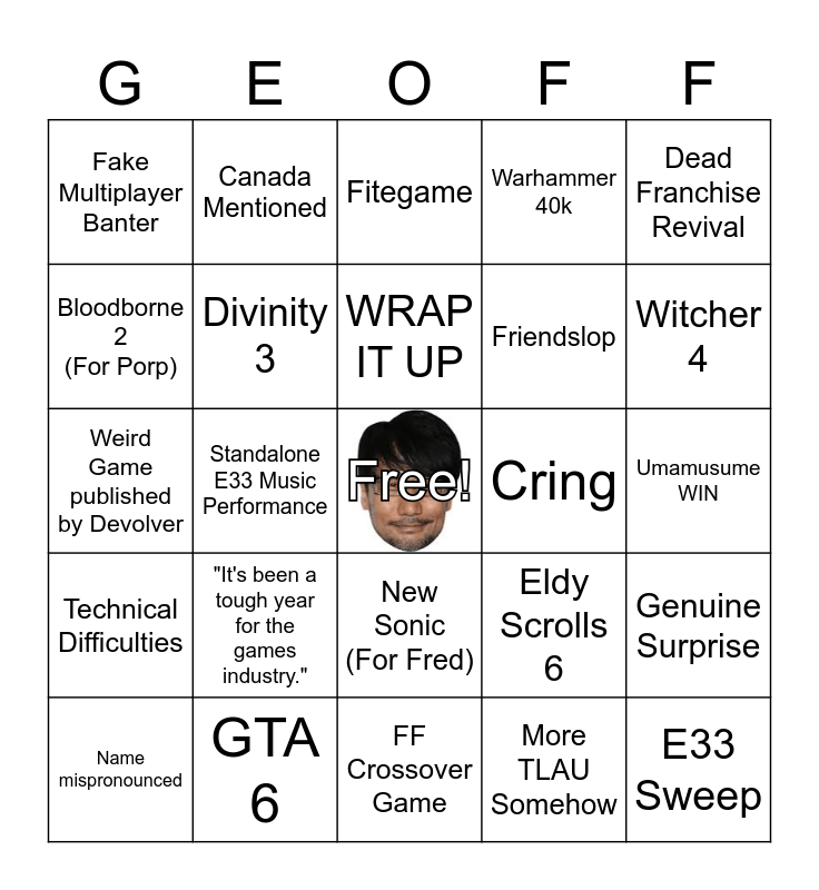 This bingo card has a free space and 53 words: Half-Life 3 REAL, E33 Sweep, AI Slop, More TLAU Somehow, "It's been a tough year for the games industry.", Sam Lake REAL, Canada Mentioned, Miss Piggy hits on Voice Actor, Bloodborne 2 (For Porp), FF7R3, Divinity 3, Stranger than Heaven, Genuine Surprise, Eldy Scrolls 6, Reluctant /Drunk Celebrity, Name mispronounced, WRAP IT UP, Cring, DMC Netflix Season 2, Dead Franchise Revival, Standalone E33 Music Performance, New Hollywood Game, Friendslop, Fake Multiplayer Banter, E33 Snub, GTA 6, Onimusha, Re9, OKAMI news, Witcher 4, Josef Fares, Fallout TV Trailer, New Survival Game, New 'Cozy' Game, No one asked for this., New Wolverine trailer, Warhammer 40k, FF Crossover Game, Fitegame, "New Game from a Beloved Creator", DON'T VAPE, Political Statement, Umamusume WIN, Shadow Dropped Game, TOO MANY Cozy Games, New Sonic (For Fred), Wow quirky, Unnecessary Hardware, Weird Game published by Devolver, Technical Difficulties, Sandbagged, Ben Starr is a meme again and "We're on a tight schedule".