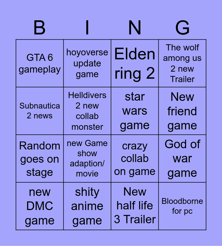 This bingo card has 20 words: God of war game, Phantom Blade Zero news, Elden ring 2, DLC, new DMC game, Subnautica 2 news, shity anime game, GTA 6 gameplay, Random goes on stage, hoyoverse update game, new Game show adaption/ movie, crazy collab on game, Helldivers 2 new collab monster, Bloodborne for pc, star wars game, new ps5 port game, New friend game, The wolf among us 2 new Trailer, New half life 3 Trailer and Celebrity surprise.