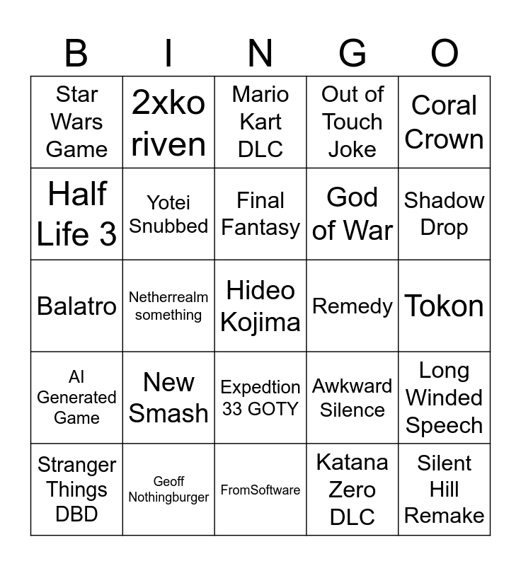 This bingo card has a free space and 24 words: New Smash, Geoff Nothingburger, Final Fantasy, Stranger Things DBD, Coral Crown, Star Wars Game, Half Life 3, 2xko riven, Remedy, Expedtion 33 GOTY, God of War, Balatro, Awkward Silence, Long Winded Speech, Yotei Snubbed, Katana Zero DLC, Tokon, Mario Kart DLC, Shadow Drop, Netherrealm something, Silent Hill Remake, AI Generated Game, Out of Touch Joke and FromSoftware.