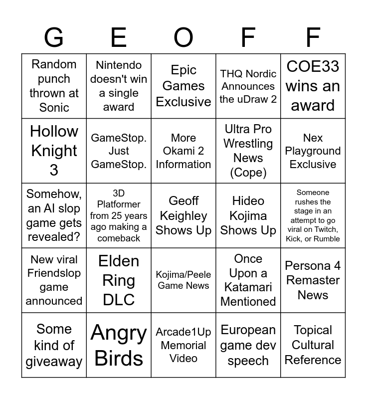 This bingo card has a free space and 24 words: Elden Ring DLC, Angry Birds, More Okami 2 Information, Some kind of giveaway, COE33 wins an award, Random punch thrown at Sonic, Hollow Knight 3, Nintendo doesn't win a single award, Hideo Kojima Shows Up, Kojima/Peele Game News, Ultra Pro Wrestling News (Cope), Somehow, an AI slop game gets revealed?, Once Upon a Katamari Mentioned, Persona 4 Remaster News, GameStop. Just GameStop., European game dev speech, Someone rushes the stage in an attempt to go viral on Twitch, Kick, or Rumble, Epic Games Exclusive, Nex Playground Exclusive, 3D Platformer from 25 years ago making a comeback, Topical Cultural Reference, New viral Friendslop game announced, THQ Nordic Announces the uDraw 2 and Arcade1Up Memorial Video.