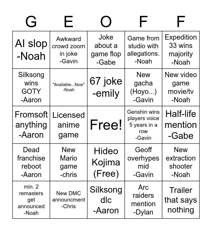 This bingo card has a free space and 24 words: New Mario game -chris, New DMC announcment -Chris, 67 joke -emily, min. 2 remasters get announced -Noah, Expedition 33 wins majority -Noah, AI slop -Noah, Silksong wins GOTY -Aaron, Awkward crowd zoom in joke -Gavin, Genshin wins players voice 5 years in a row -Gavin, Hideo Kojima (Free), New gacha (Hoyo...) -Gavin, Fromsoft anything -Aaron, Geoff overhypes mid -Gavin, New extraction shooter -Noah, "Available...Now" -Noah, Arc raiders mention -Dylan, Half-life mention -Gabe, Joke about a game flop -Gabe, New video game movie/tv -Noah, Licensed anime game, Trailer that says nothing, Dead franchise reboot -Aaron, Game from studio with allegations. -Noah and Silksong dlc -Aaron.