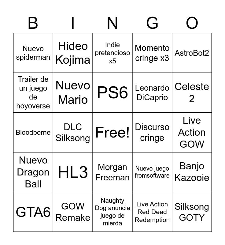 This bingo card has a free space and 24 words: HL3, GOW Remake, PS6, GTA6, AstroBot2, Nuevo spiderman, Trailer de un juego de hoyoverse, Hideo Kojima, Discurso cringe, Morgan Freeman, Leonardo DiCaprio, Bloodborne, Nuevo juego fromsoftware, Banjo Kazooie, Nuevo Mario, Live Action Red Dead Redemption, Live Action GOW, Indie pretencioso x5, Celeste 2, DLC Silksong, Silksong GOTY, Nuevo Dragon Ball, Momento cringe x3 and Naughty Dog anuncia juego de mierda.