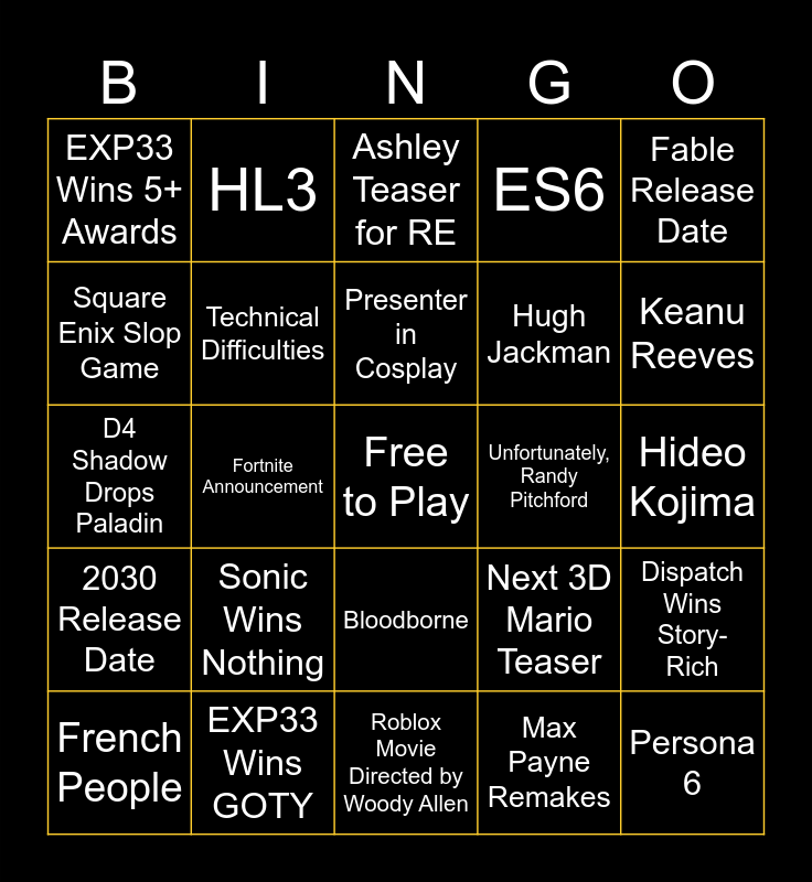 This bingo card has a free space and 24 words: Sonic Wins Nothing, EXP33 Wins GOTY, Presenter in Cosplay, French People, Fable Release Date, EXP33 Wins 5+ Awards, Square Enix Slop Game, HL3, Unfortunately, Randy Pitchford, Bloodborne, Hugh Jackman, D4 Shadow Drops Paladin, Next 3D Mario Teaser, Dispatch Wins Story-Rich, Technical Difficulties, Max Payne Remakes, Hideo Kojima, Ashley Teaser for RE, Keanu Reeves, Fortnite Announcement, Persona 6, 2030 Release Date, ES6 and Roblox Movie Directed by Woody Allen.