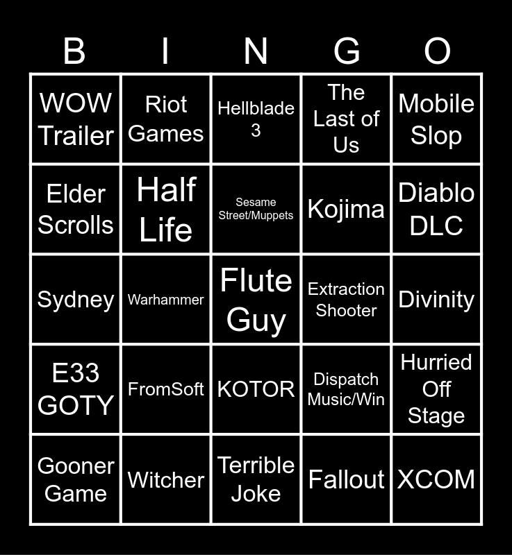 This bingo card has a free space and 24 words: FromSoft, Witcher, Sesame Street/Muppets, Gooner Game, Mobile Slop, WOW Trailer, Elder Scrolls, Riot Games, Extraction Shooter, KOTOR, Kojima, Sydney, Dispatch Music/Win, Hurried Off Stage, Half Life, Fallout, Divinity, Hellblade 3, Diablo DLC, Warhammer, XCOM, E33 GOTY, The Last of Us and Terrible Joke.