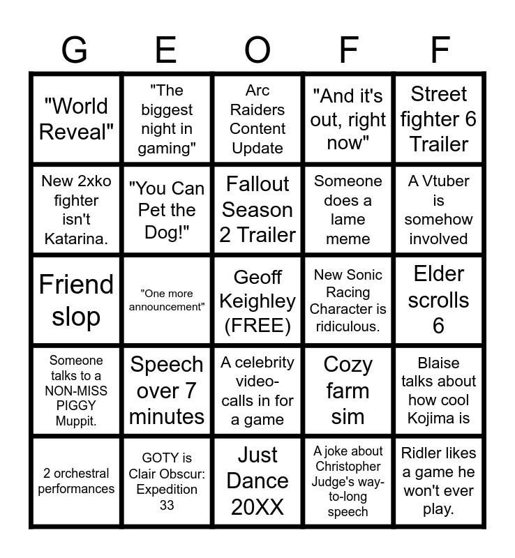 This bingo card has a free space and 38 words: Nintendo shows us something we've already seen, Graphic tee + Sports coat, Old celebrity that doesn't know what they're talking about, "You Can Pet the Dog!", Blaise talks about how cool Kojima is, Speech over 7 minutes, Fallout Season 2 Trailer, Anime game trailer., Street fighter 6 Trailer, Someone does a lame meme, "One more announcement", "And it's out, right now", Ridler likes a game he won't ever play., Elder scrolls 6, New 2xko fighter isn't Katarina., Someone talks to a NON-MISS PIGGY Muppit., Samurai game., Arc Raiders Content Update, New Borderlands 4 vault hunter, New Sonic Racing Character is ridiculous., "World Reveal", GOTY is Clair Obscur: Expedition 33, A Vtuber is somehow involved, 2 orchestral performances, Alternative performance (Dance etc.), Just Dance 20XX, Valve announces something., Astrobot 2, The stream lags, Fortnite Trailer, New God of War, A celebrity video-calls in for a game, A joke about Christopher Judge's way-to-long speech, "The biggest night in gaming", Unintended interruption, Cozy farm sim, Friend slop and Blaise correctly guesses the goty.