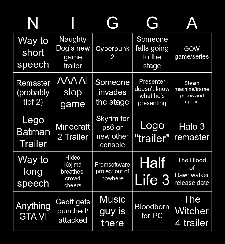 This bingo card has 25 words: Hideo Kojima breathes, crowd cheers, Music guy is there, Someone invades the stage, Anything GTA VI, GOW game/series, Way to short speech, Remaster (probably tlof 2), Naughty Dog's new game trailer, Logo "trailer", Fromsoftware project out of nowhere, Presenter doesn't know what he's presenting, Lego Batman Trailer, Half Life 3, The Blood of Dawnwalker release date, AAA AI slop game, The Witcher 4 trailer, Halo 3 remaster, Cyberpunk 2, Steam machine/frame prices and specs, Minecraft 2 Trailer, Skyrim for ps6 or new other console, Geoff gets punched/ attacked, Way to long speech, Someone falls going to the stage and Bloodborn for PC.