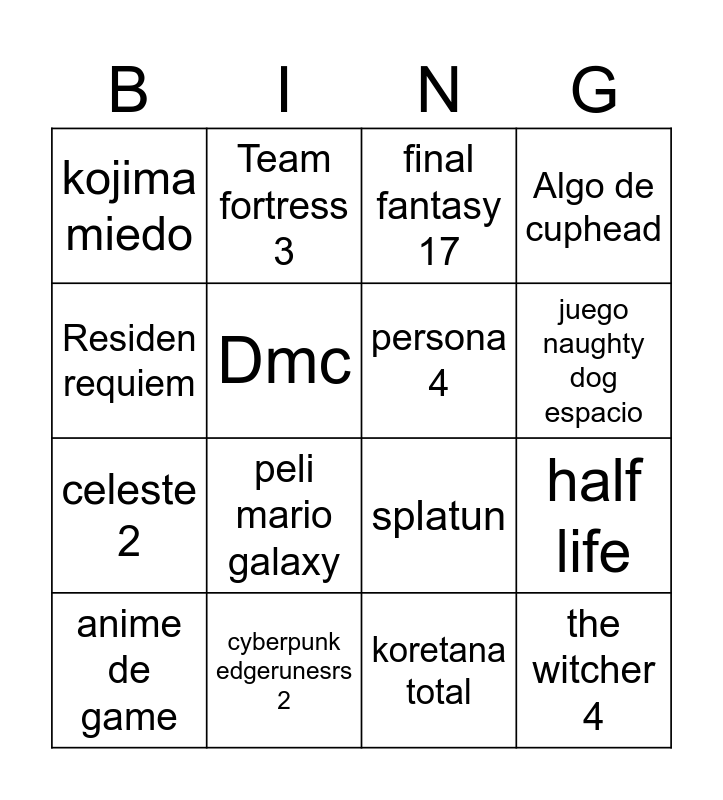 This bingo card has 16 words: cyberpunk edgerunesrs 2, half life, final fantasy 17, kojima miedo, celeste 2, Team fortress 3, splatun, koretana total, Residen requiem, Dmc, anime de game, Algo de cuphead, peli mario galaxy, juego naughty dog espacio, persona 4 and the witcher 4.