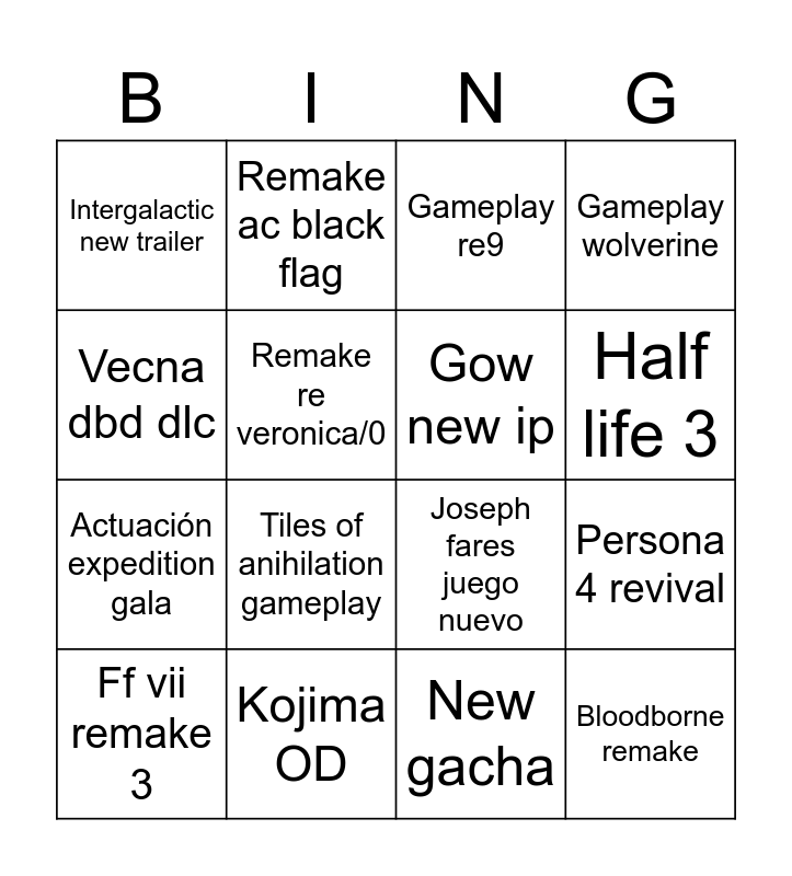 This bingo card has 16 words: Kojima OD, Persona 4 revival, Gameplay re9, Intergalactic new trailer, Actuación expedition gala, Remake ac black flag, Joseph fares juego nuevo, New gacha, Vecna dbd dlc, Remake re veronica/0, Ff vii remake 3, Gameplay wolverine, Tiles of anihilation gameplay, Half life 3, Gow new ip and Bloodborne remake.