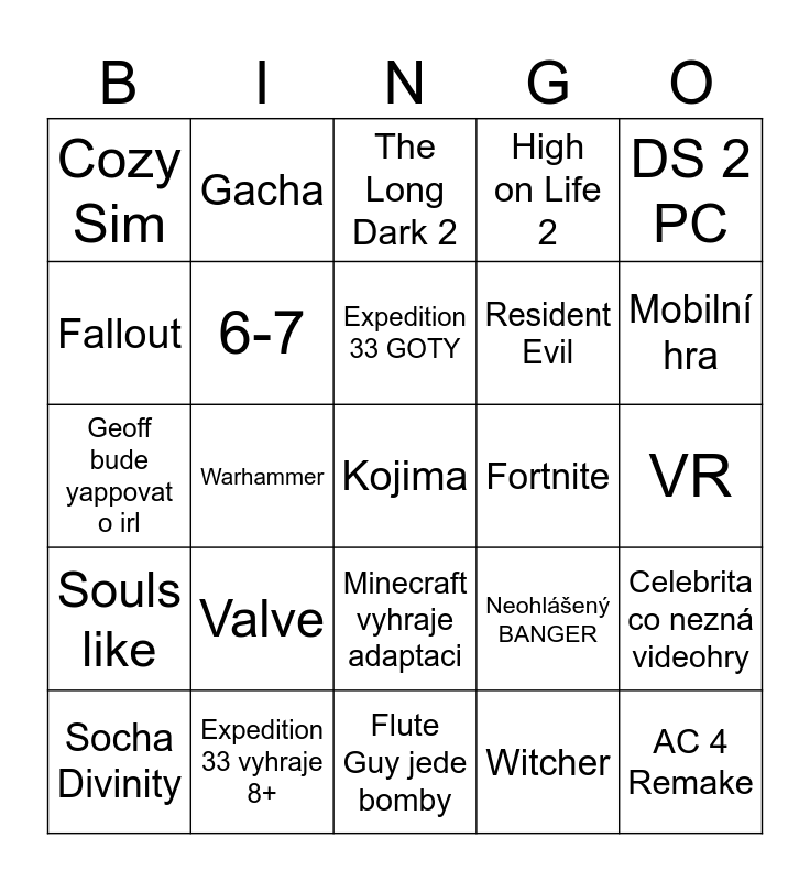 This bingo card has a free space and 24 words: Valve, Expedition 33 vyhraje 8+, Expedition 33 GOTY, Socha Divinity, DS 2 PC, Cozy Sim, Fallout, Gacha, Fortnite, Minecraft vyhraje adaptaci, Resident Evil, Geoff bude yappovat o irl, Neohlášený BANGER, Celebrita co nezná videohry, 6-7, Witcher, VR, The Long Dark 2, Mobilní hra, Warhammer, AC 4 Remake, Souls like, High on Life 2 and Flute Guy jede bomby.