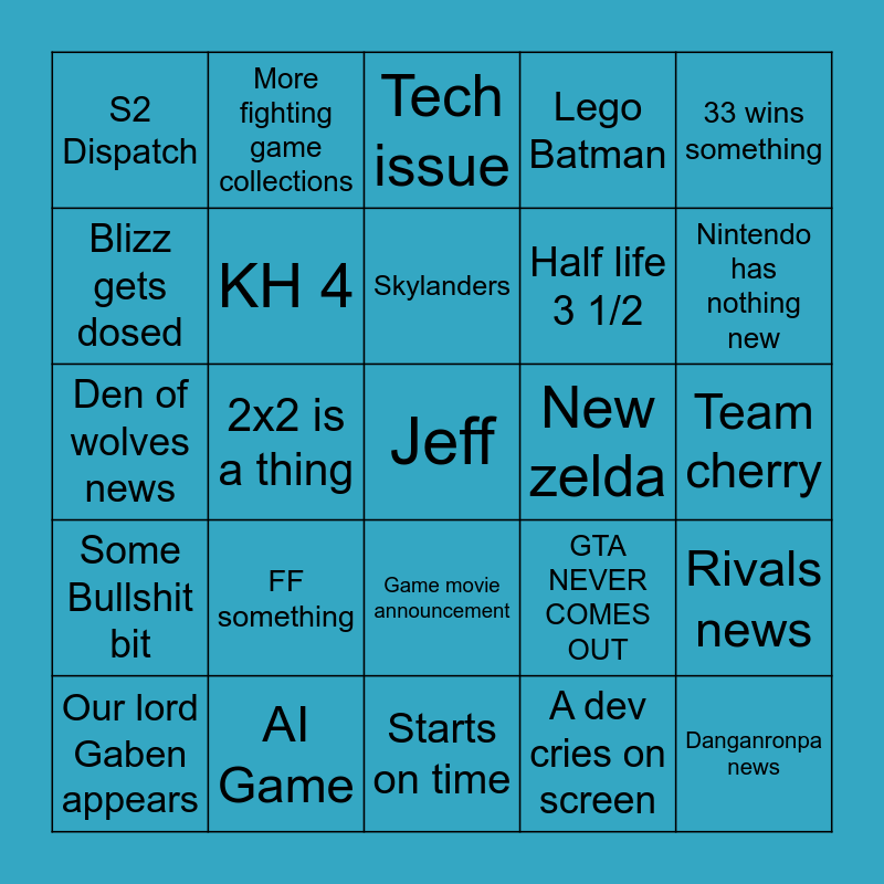 This bingo card has a free space and 24 words: FF something, AI Game, Skylanders, Our lord Gaben appears, 33 wins something, S2 Dispatch, Blizz gets dosed, More fighting game collections, New zelda, Game movie announcement, Half life 3 1/2, Den of wolves news, GTA NEVER COMES OUT, Rivals news, KH 4, A dev cries on screen, Team cherry, Tech issue, Nintendo has nothing new, 2x2 is a thing, Danganronpa news, Some Bullshit bit, Lego Batman and Starts on time.