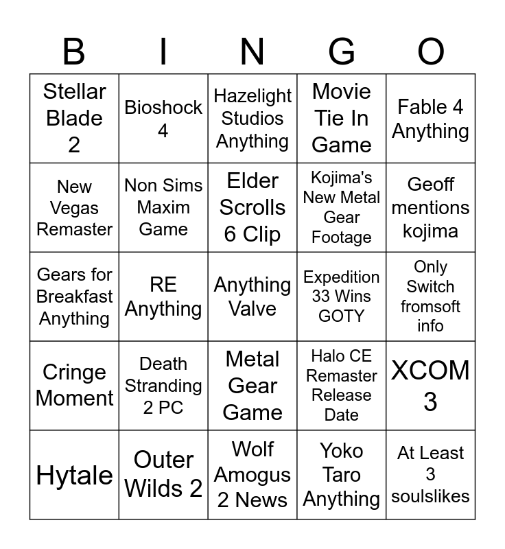 This bingo card has a free space and 24 words: Death Stranding 2 PC, Outer Wilds 2, Elder Scrolls 6 Clip, Hytale, Fable 4 Anything, Stellar Blade 2, New Vegas Remaster, Bioshock 4, Expedition 33 Wins GOTY, Metal Gear Game, Kojima's New Metal Gear Footage, Gears for Breakfast Anything, Halo CE Remaster Release Date, XCOM 3, Non Sims Maxim Game, Yoko Taro Anything, Only Switch fromsoft info, Hazelight Studios Anything, Geoff mentions kojima, RE Anything, At Least 3 soulslikes, Cringe Moment, Movie Tie In Game and Wolf Amogus 2 News.