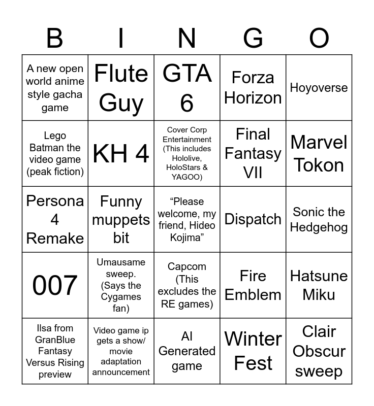 This bingo card has a free space and 24 words: Umausame sweep. (Says the Cygames fan), Video game ip gets a show/ movie adaptation announcement, Cover Corp Entertainment (This includes Hololive, HoloStars & YAGOO), Ilsa from GranBlue Fantasy Versus Rising preview, Hoyoverse, A new open world anime style gacha game, Lego Batman the video game (peak fiction), Flute Guy, Dispatch, Capcom (This excludes the RE games), Final Fantasy VII, Persona 4 Remake, Fire Emblem, Hatsune Miku, KH 4, Winter Fest, Sonic the Hedgehog, GTA 6, Marvel Tokon, Funny muppets bit, Clair Obscur sweep, 007, Forza Horizon and AI Generated game.