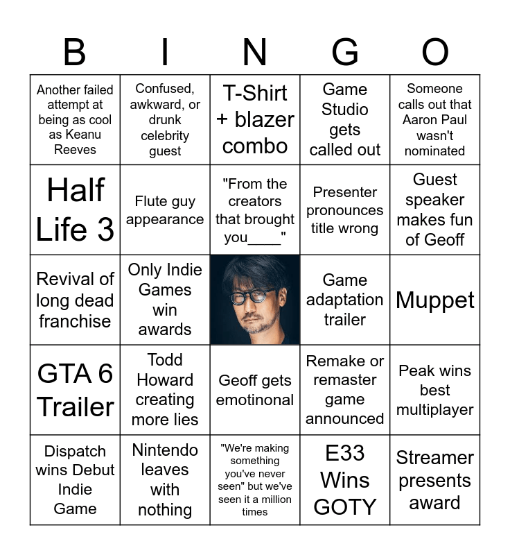 This bingo card has a free space and 24 words: Todd Howard creating more lies, Nintendo leaves with nothing, "From the creators that brought you____", Dispatch wins Debut Indie Game, Someone calls out that Aaron Paul wasn't nominated, Another failed attempt at being as cool as Keanu Reeves, Half Life 3, Confused, awkward, or drunk celebrity guest, Game adaptation trailer, Geoff gets emotinonal, Presenter pronounces title wrong, Revival of long dead franchise, Remake or remaster game announced, Peak wins best multiplayer, Flute guy appearance, E33 Wins GOTY, Muppet, T-Shirt + blazer combo, Guest speaker makes fun of Geoff, Only Indie Games win awards, Streamer presents award, GTA 6 Trailer, Game Studio gets called out and "We're making something you've never seen" but we've seen it a million times.