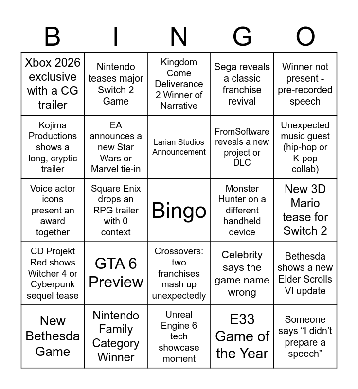 This bingo card has a free space and 24 words: GTA 6 Preview, Nintendo Family Category Winner, Larian Studios Announcement, New Bethesda Game, Winner not present - pre-recorded speech, Xbox 2026 exclusive with a CG trailer, Kojima Productions shows a long, cryptic trailer, Nintendo teases major Switch 2 Game, Monster Hunter on a different handheld device, Crossovers: two franchises mash up unexpectedly, FromSoftware reveals a new project or DLC, Voice actor icons present an award together, Celebrity says the game name wrong, Bethesda shows a new Elder Scrolls VI update, EA announces a new Star Wars or Marvel tie-in, E33 Game of the Year, New 3D Mario tease for Switch 2, Kingdom Come Deliverance 2 Winner of Narrative, Unexpected music guest (hip-hop or K-pop collab), Square Enix drops an RPG trailer with 0 context, Someone says “I didn’t prepare a speech”, CD Projekt Red shows Witcher 4 or Cyberpunk sequel tease, Sega reveals a classic franchise revival and Unreal Engine 6 tech showcase moment.