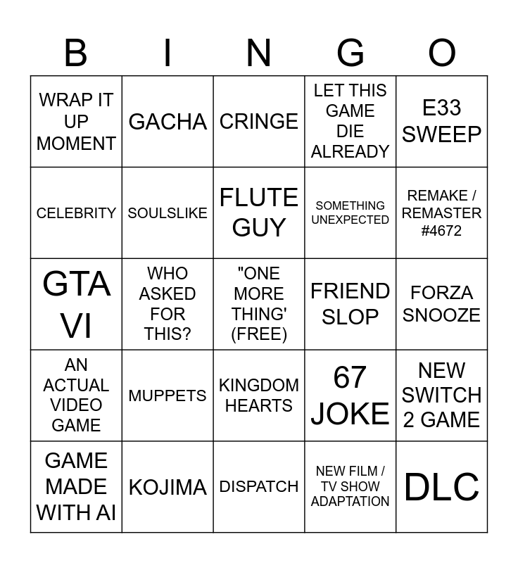 This bingo card has a free space and 24 words: MUPPETS, KOJIMA, FLUTE GUY, GAME MADE WITH AI, E33 SWEEP, WRAP IT UP MOMENT, CELEBRITY, GACHA, FRIEND SLOP, KINGDOM HEARTS, SOMETHING UNEXPECTED, GTA VI, 67 JOKE, NEW SWITCH 2 GAME, SOULSLIKE, NEW FILM / TV SHOW ADAPTATION, FORZA SNOOZE, CRINGE, REMAKE / REMASTER #4672, WHO ASKED FOR THIS?, DLC, AN ACTUAL VIDEO GAME, LET THIS GAME DIE ALREADY and DISPATCH.