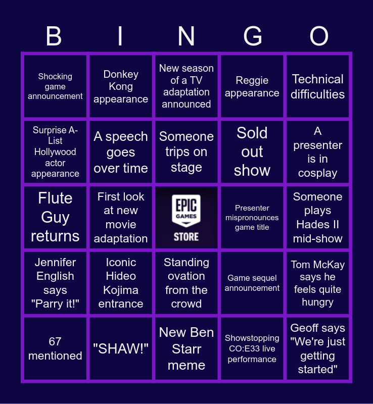 This bingo card has a free space and 25 words: 67 mentioned, Iconic Hideo Kojima entrance, Someone trips on stage, Showstopping CO:E33 live performance, A presenter is in cosplay, Shocking game announcement, Donkey Kong appearance, New season of a TV adaptation announced, Sold out show, Tom McKay says he feels quite hungry, Flute Guy returns, A speech goes over time, Game sequel announcement, Geoff says "We're just getting started", Surprise A-List Hollywood actor appearance, "SHAW!", New Ben Starr meme, Reggie appearance, Someone plays Hades II mid-show, Jennifer English says "Parry it!", First look at new movie adaptation, Standing ovation from the crowd, Presenter mispronounces game title, Technical difficulties and Drunk French guy appears.