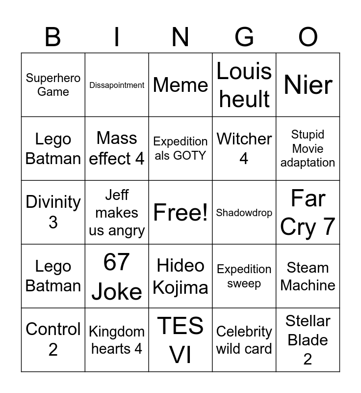 This bingo card has a free space and 24 words: 67 Joke, Kingdom hearts 4, Expedition als GOTY, Control 2, Nier, Superhero Game, Lego Batman, Dissapointment, Shadowdrop, Hideo Kojima, Witcher 4, Divinity 3, Expedition sweep, Steam Machine, Mass effect 4, Celebrity wild card, Far Cry 7, Meme, Stupid Movie adaptation, Jeff makes us angry, Stellar Blade 2, Lego Batman, Louis heult and TES VI.