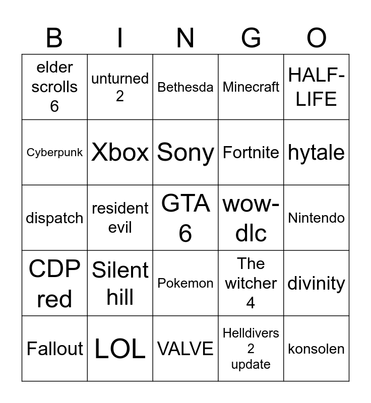 This bingo card has a free space and 24 words: Silent hill, LOL, Sony, Fallout, HALF-LIFE, elder scrolls 6, Cyberpunk, unturned 2, wow-dlc, Pokemon, Fortnite, dispatch, The witcher 4, divinity, Xbox, Helldivers 2 update, Nintendo, Bethesda, hytale, resident evil, konsolen, CDP red, Minecraft and VALVE.