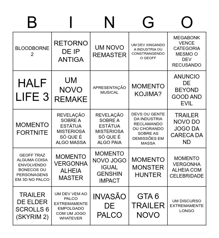 This bingo card has 25 words: GEOFF TRAZ ALGUMA COISA ENVOLVENDO BONECOS OU PERSONAGENS EM 3D NO PALCO, UM DEV VEM AO PALCO EXTREMAMENTE EMPOLGADO COM UM JOGO WHATEVER, REVELAÇÃO SOBRE A ESTÁTUA MISTERIOSA SÓ QUE É ALGO PAIA, GTA 6 TRAILER NOVO, MEGABONK VENCE CATEGORIA MESMO O DEV RECUSANDO, BLOODBORNE 2, RETORNO DE IP ANTIGA, UM NOVO REMASTER, DEVS OU GENTE DA INDUSTRIA RECLAMANDO OU CHORANDO SOBRE AS DEMISSÕES EM MASSA, MOMENTO VERGONHA ALHEIA COM CELEBRIDADE, HALF LIFE 3, UM NOVO REMAKE, INVASÃO DE PALCO, MOMENTO MONSTER HUNTER, ANUNCIO DE BEYOND GOOD AND EVIL, TRAILER DE ELDER SCROLLS 6 (SKYRIM 2), REVELAÇÃO SOBRE A ESTÁTUA MISTERIOSA SÓ QUE É ALGO MASSA, APRESENTAÇÃO MUSICAL, MOMENTO KOJIMA?, TRAILER NOVO DO JOGO DA CARECA DA ND, MOMENTO FORTNITE, MOMENTO VERGONHA ALHEIA MASTER, MOMENTO NOVO JOGO IGUAL GENSHIN IMPACT, UM DEV XINGANDO A INDUSTRIA OU CONSTRANGENDO O GEOFF and UM DISCURSO EXTREMAMENTE LONGO.