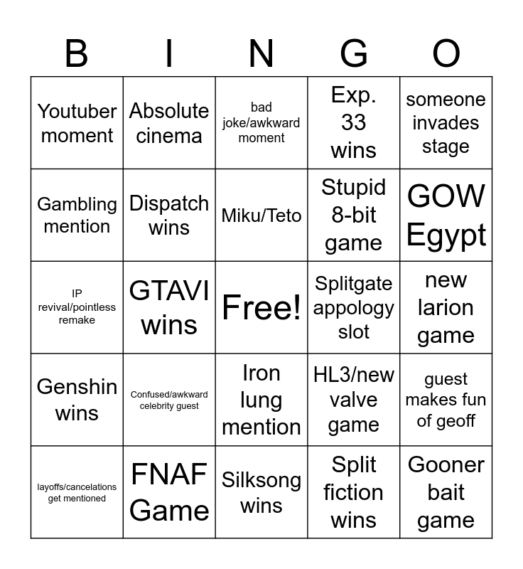 This bingo card has a free space and 24 words: Confused/awkward celebrity guest, FNAF Game, Miku/Teto, layoffs/cancelations get mentioned, someone invades stage, Youtuber moment, Gambling mention, Absolute cinema, Splitgate appology slot, Iron lung mention, Stupid 8-bit game, IP revival/pointless remake, HL3/new valve game, guest makes fun of geoff, Dispatch wins, Split fiction wins, new larion game, bad joke/awkward moment, GOW Egypt, GTAVI wins, Gooner bait game, Genshin wins, Exp. 33 wins and Silksong wins.