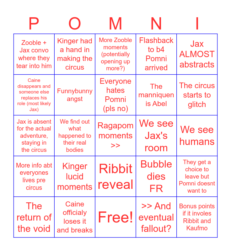 This bingo card has 25 words: More info abt everyones lives pre circus, Caine officialy loses it and breaks, Ragapom moments >>, >> And eventual fallout?, Jax ALMOST abstracts, Zooble + Jax convo where they tear into him, Kinger had a hand in making the circus, More Zooble moments (potentially opening up more?), We see Jax's room, They get a choice to leave but Pomni doesnt want to, Caine disappears and someone else replaces his role (most likely Jax), Funnybunny angst, Free!, Bubble dies FR, The circus starts to glitch, The return of the void, We find out what happened to their real bodies, Everyone hates Pomni (pls no), The manniquen is Abel, We see humans, Jax is absent for the actual adventure, staying in the circus, Kinger lucid moments, Ribbit reveal, Flashback to b4 Pomni arrived and Bonus points if it involes Ribbit and Kaufmo.
