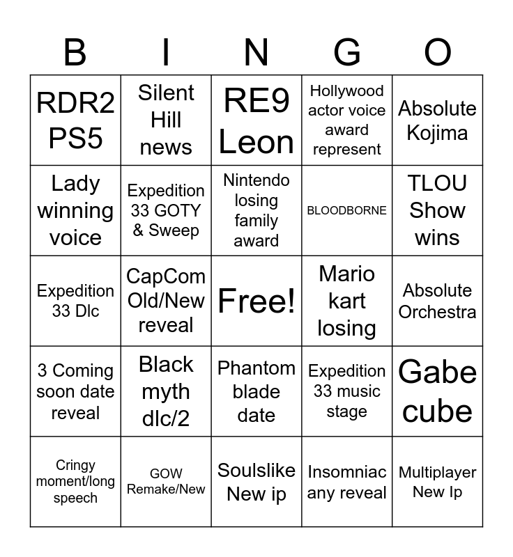 This bingo card has a free space and 24 words: Black myth dlc/2, GOW Remake/New, Nintendo losing family award, Cringy moment/long speech, Absolute Kojima, RDR2 PS5, Lady winning voice, Silent Hill news, Mario kart losing, Phantom blade date, BLOODBORNE, Expedition 33 Dlc, Expedition 33 music stage, Gabe cube, Expedition 33 GOTY & Sweep, Insomniac any reveal, Absolute Orchestra, RE9 Leon, TLOU Show wins, CapCom Old/New reveal, Multiplayer New Ip, 3 Coming soon date reveal, Hollywood actor voice award represent and Soulslike New ip.