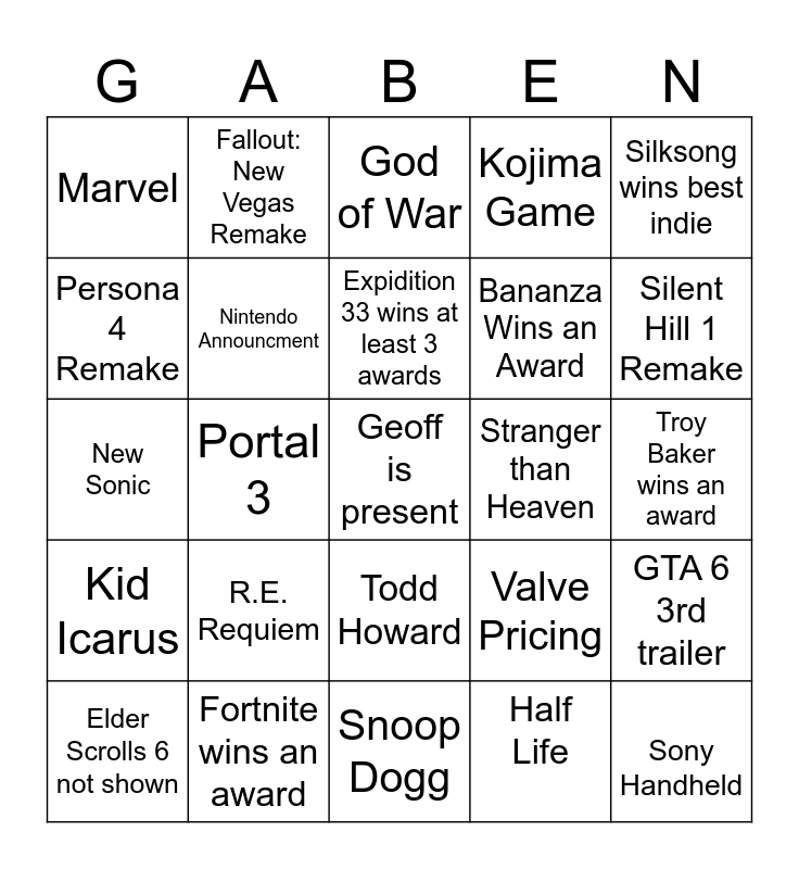 This bingo card has a free space and 24 words: R.E. Requiem, Fortnite wins an award, Expidition 33 wins at least 3 awards, Elder Scrolls 6 not shown, Silksong wins best indie, Marvel, Persona 4 Remake, Fallout: New Vegas Remake, Stranger than Heaven, Todd Howard, Bananza Wins an Award, New Sonic, Valve Pricing, GTA 6 3rd trailer, Nintendo Announcment, Half Life, Troy Baker wins an award, God of War, Silent Hill 1 Remake, Portal 3, Sony Handheld, Kid Icarus, Kojima Game and Snoop Dogg.