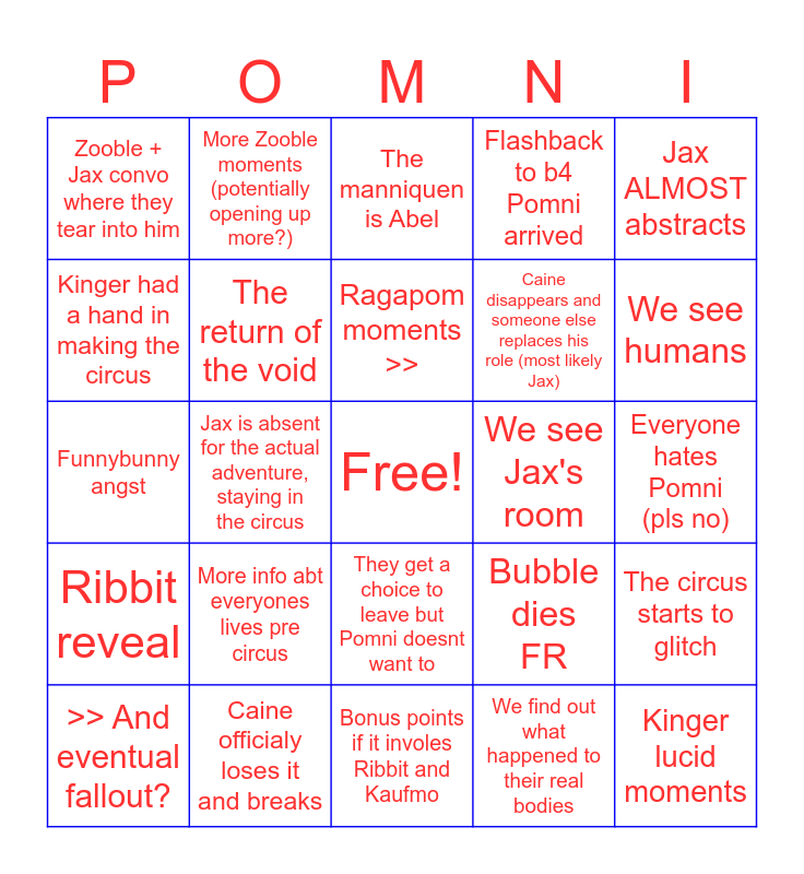 This bingo card has a free space and 24 words: More info abt everyones lives pre circus, Caine officialy loses it and breaks, Ragapom moments >>, >> And eventual fallout?, Jax ALMOST abstracts, Zooble + Jax convo where they tear into him, Kinger had a hand in making the circus, More Zooble moments (potentially opening up more?), We see Jax's room, They get a choice to leave but Pomni doesnt want to, Caine disappears and someone else replaces his role (most likely Jax), Funnybunny angst, Bubble dies FR, The circus starts to glitch, The return of the void, We find out what happened to their real bodies, Everyone hates Pomni (pls no), The manniquen is Abel, We see humans, Jax is absent for the actual adventure, staying in the circus, Kinger lucid moments, Ribbit reveal, Flashback to b4 Pomni arrived and Bonus points if it involes Ribbit and Kaufmo.