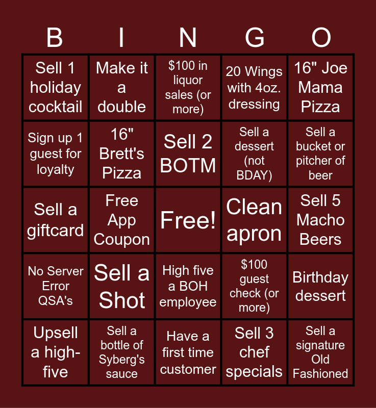 This bingo card has a free space and 24 words: Sell a Shot, Sell a bottle of Syberg's sauce, Sell 2 BOTM, Upsell a high-five, 16" Joe Mama Pizza, Sell 1 holiday cocktail, Sign up 1 guest for loyalty, Make it a double, Clean apron, High five a BOH employee, Sell a dessert (not BDAY), Sell a giftcard, $100 guest check (or more), Birthday dessert, 16" Brett's Pizza, Sell 3 chef specials, Sell 5 Macho Beers, $100 in liquor sales (or more), Sell a bucket or pitcher of beer, Free App Coupon, Sell a signature Old Fashioned, No Server Error QSA's, 20 Wings with 4oz. dressing and Have a first time customer.